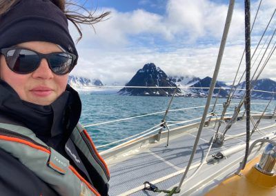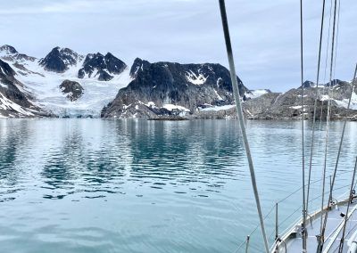Van Virgohamna varen we de volgende dag een kleine twintig mijl verder naar Sallyhamna. Er staat een mooie wind in de goede richting, en we kunnen het hele stuk lekker aan de wind, ‘op één oor’, zeilen. De tocht is adembenemend mooi. De spitse bergtoppen steken scherp af tegen de hemel. De ruige noordwestkust is dé plek waar Spitsbergen zijn naam aan te danken heeft, dit is namelijk waar Spitsbergen ontdekker Willem Barentsz voor het eerst voet aan wal zette dacht: “wow, dat zijn spitse bergen”. Het is het gebied dat wij het allermooist vinden.
