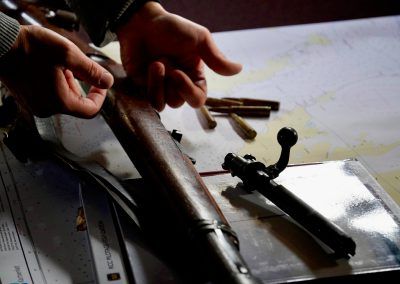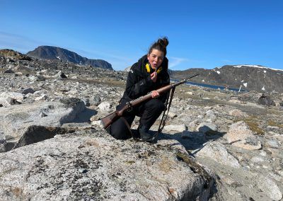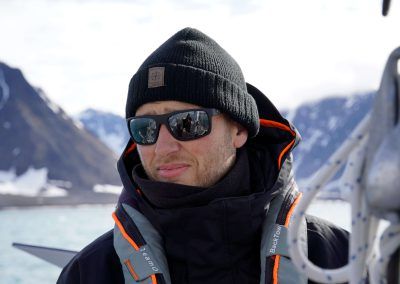 Die avond en de dag erop liggen we in een heerlijk rustige baai met een strakblauwe lucht. We zitten zelfs even in het zonnetje, uit de wind, in een hemdje in de kuip – een unicum! We hebben een druk programma deze dag: we bekijken de Birgerbreengletsjer met de bijboot, zo’n tien minuutjes varen het fjord in. We lopen een stuk over het ijs en de sneeuw en zien veel zeehonden en vogeltjes op de drijvende ijsblokken. Terug bij Saraban’de oefenen we aan land allebei even met het geweer. Op een open stuk zetten we wat targets van hout op, zo’n vijftig meter verderop. Met verder niemand in de buurt – alleen wij, Saraban’de en de bergen om ons heen – hebben we de grootste lol met het schieten. Zo gaaf en bijzonder dat we dit hier gewoon kunnen doen!