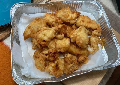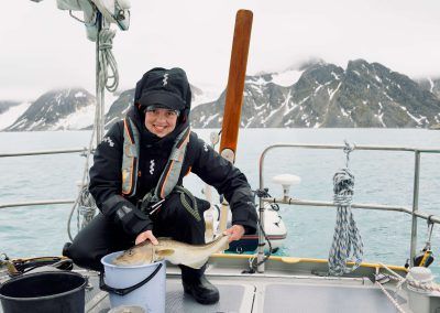 Net voordat we de baai van Sallyhamna bereiken, valt de wind weg. We besluiten nog even te vissen en gooien onze hengel uit, precies bij een steile richel onder water. Binnen een paar minuten hebben we beet – drie dikke kabeljauwen aan één haak. Even later vangen we er nog drie en hebben we er zes in totaal! We fileren ze op het achterdek, vriezen de filets in en bewaren de rest voor kibbeling.