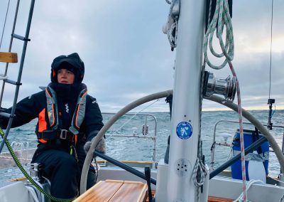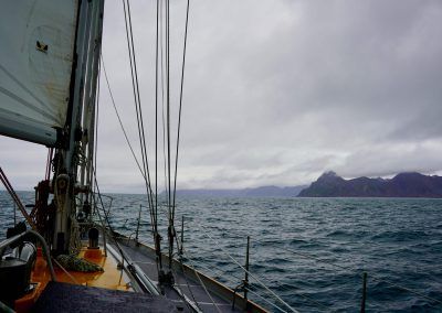 In de loop van de dag trekt de wind steeds meer aan. Nog zo’n 2 uur varen tot de beschutte baai van Kinnvika zitten we inmiddels in 30 knopen wind (7 Beaufort) met golven tot wel 3 meter. Het laatste stuk halve wind in de golven tussen alle rotsen door om de baai in te komen, maakt de tocht best spannend; we moeten zelfs twee stormrondjes maken omdat we in de harde wind niet kunnen gijpen. Als we eindelijk de baai invaren en de golven weg zijn, zijn we ook wel even opgelucht dat we het weer gehaald hebben. Niet dat het relaxen dan kan beginnen – integendeel. Het ankeren blijkt een ramp in Kinnvika, met meters dikke kelp op de bodem. Het kost ons wel een uur om eindelijk grip te krijgen met het anker en vast te liggen. Het is inmiddels 23:00 uur ’s avonds, 3 graden en nog steeds veel wind. We zijn blij dat we onder de wol kunnen.