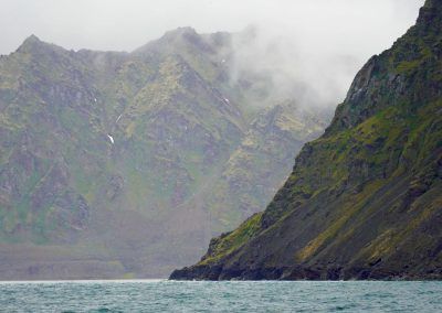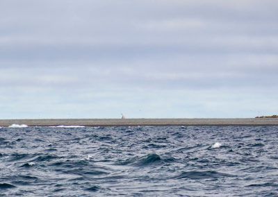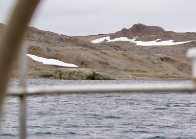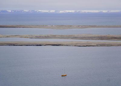 De volgende dag brengt een stevige westenwind ons langs de noordpunt van Spitsbergen, een stuk dat we nog niet eerder hebben bevaren. Halverwege zien we Moffen, een vlak eiland met een grote walruskolonie. Vanaf zee zien we hun logge lichamen op het strand liggen, dicht tegen elkaar aan. We blijven op een afstand van zo’n 2 mijl, want het gebied is beschermd, maar we kunnen ze toch best goed zien. Even later ronden we het noordelijkste puntje van Spitsbergen – een heel bijzonder gevoel. Vanaf nu gaat de route weer zuidwaarts!