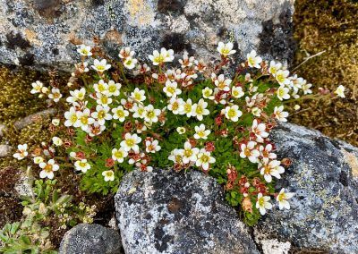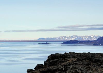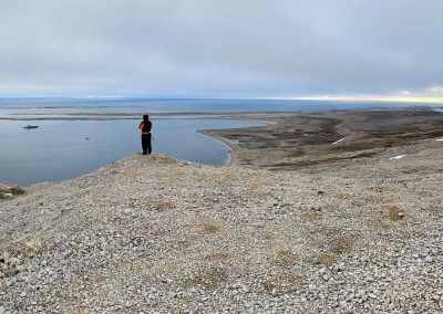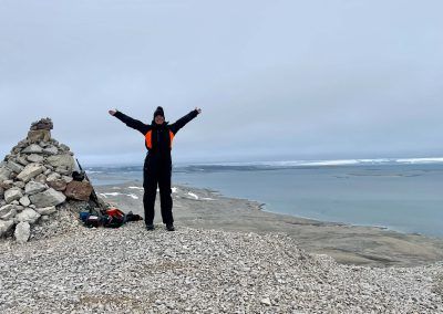 Dezelfde dag staat de Zeeuwse Uitkijk-wandeling op Ytre Norskøya ook nog op het programma, een activiteit die hoog op onze lijst staat. In de zeventiende eeuw liepen de Nederlandse walvisvaarders ook al naar de top van deze berg om te kijken waar het pakijs was en waar de walvissen zwommen, zodat ze er vervolgens op konden jagen. Zij noemden het eiland de Zeeuwse Uitkijk en later werd dit hernoemd door de Noren. De vele graven zijn nog steeds te zien, met – voor zover wij weten – vooral jongens van rond de 25 jaar… een realistische herinnering aan een ruige periode in de geschiedenis. We hebben supermazzel met het weer vandaag: het is uitzonderlijk rustig. We ankeren vlak naast het eiland, klimmen naar boven, maken koffie en zitten een tijdje te kijken over de eindeloze zee, die paarsachtig als een spiegel tot de horizon reikt.