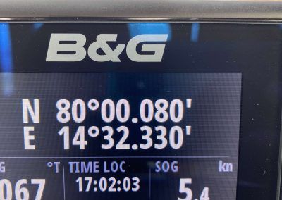 Het is 19 juli ’25 en we zijn nu zo’n twee weken op Spitsbergen. In Ny Ålesund tanken we de dieseltank tot de rand toe vol – 680 liter in totaal – want dit is de laatste plek waar we kunnen bijvullen voordat we verder noordwaarts gaan. Wat we nu aan boord hebben, moet genoeg zijn om helemaal rondom Spitsbergen te varen. Dat idee maakt het avontuur best spannend. Met alleen motoren redden we het niet, dus er moet gezeild worden. Het weerbericht ziet er goed uit: een ruime koers met een zuidwestenwind van 16 tot 20 knopen, precies zoals we het graag hebben. We besluiten vroeg te vertrekken, in de hoop dat we de hele dag kunnen zeilen en zo de diesel nog even kunnen laten waar die hoort: in de tank.