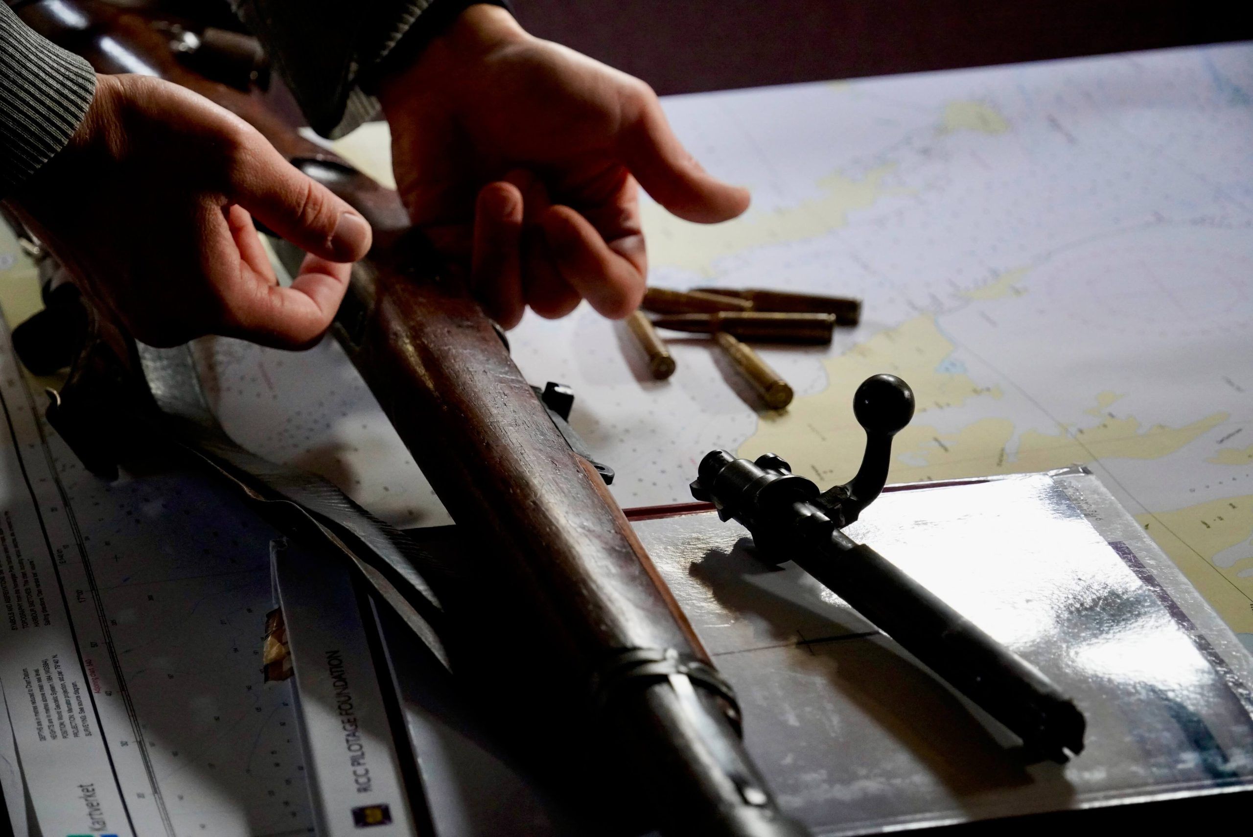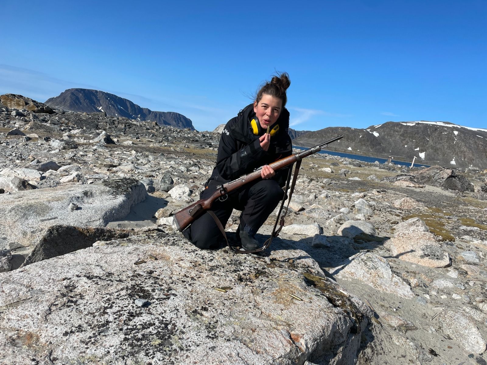 Die avond en de dag erop liggen we in een heerlijk rustige baai met een strakblauwe lucht. We zitten zelfs even in het zonnetje, uit de wind, in een hemdje in de kuip – een unicum! We hebben een druk programma deze dag: we bekijken de Birgerbreengletsjer met de bijboot, zo’n tien minuutjes varen het fjord in. We lopen een stuk over het ijs en de sneeuw en zien veel zeehonden en vogeltjes op de drijvende ijsblokken. Terug bij Saraban’de oefenen we aan land allebei even met het geweer. Op een open stuk zetten we wat targets van hout op, zo’n vijftig meter verderop. Met verder niemand in de buurt – alleen wij, Saraban’de en de bergen om ons heen – hebben we de grootste lol met het schieten. Zo gaaf en bijzonder dat we dit hier gewoon kunnen doen!