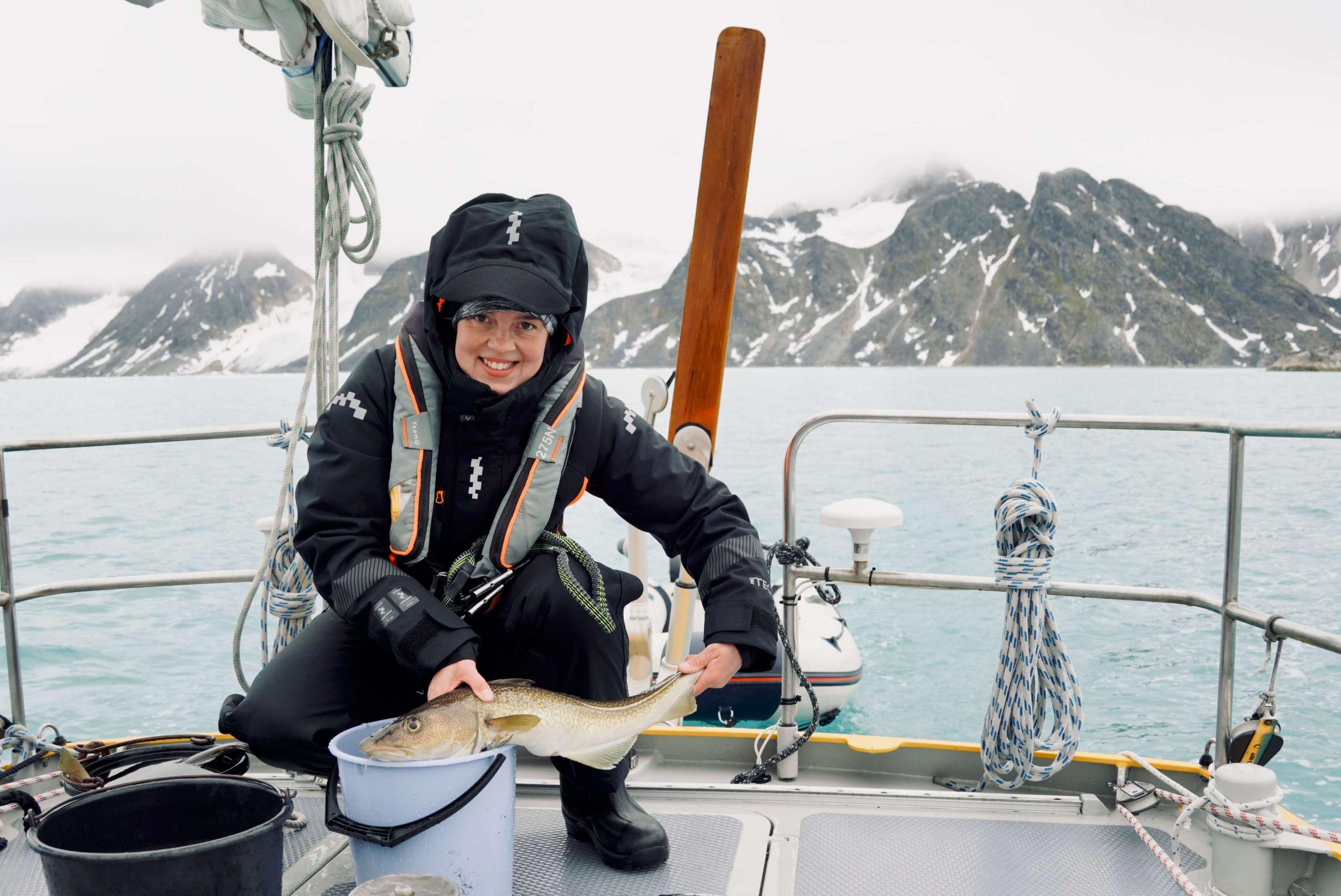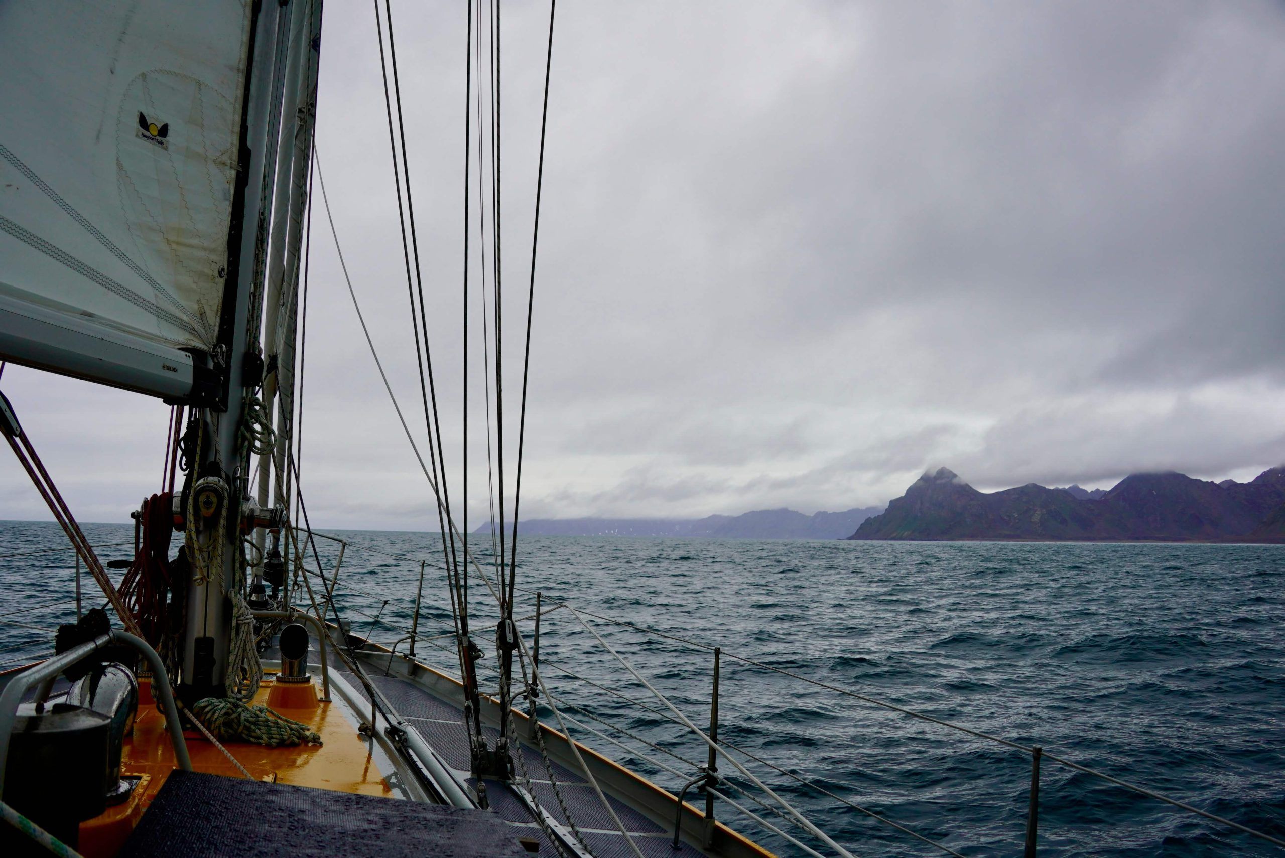 Net voordat we de baai van Sallyhamna bereiken, valt de wind weg. We besluiten nog even te vissen en gooien onze hengel uit, precies bij een steile richel onder water. Binnen een paar minuten hebben we beet – drie dikke kabeljauwen aan één haak. Even later vangen we er nog drie en hebben we er zes in totaal! We fileren ze op het achterdek, vriezen de filets in en bewaren de rest voor kibbeling.