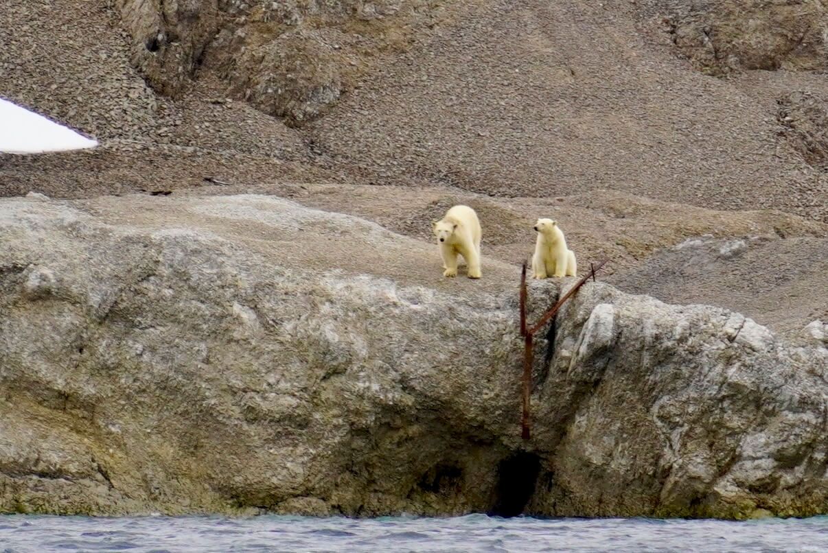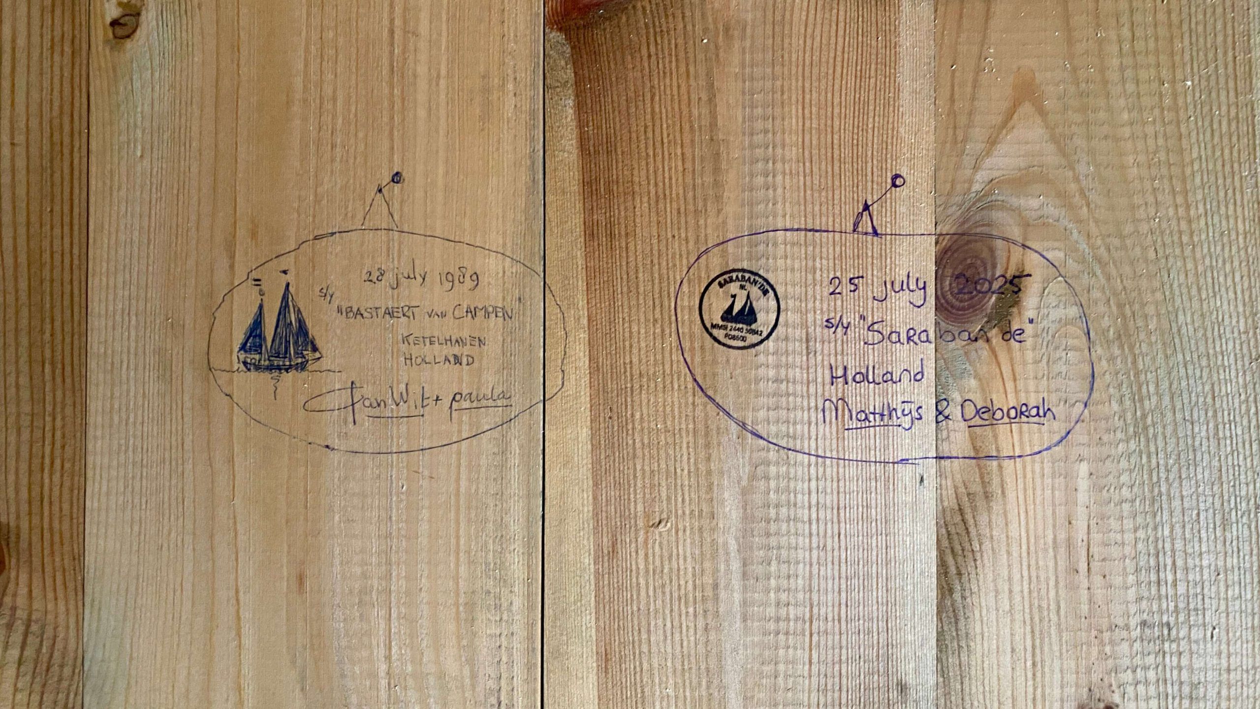 Als de volgende dag de wind is gaan liggen en Saraban’de nog steeds op dezelfde plek ligt, gaan we weer aan land. In Kinnvika is een enorm onderzoeksstation met wel dertien gebouwen waar sinds 1957 allerlei onderzoeken worden gedaan. Oorspronkelijk naar meteorologie, geomagnetisme en het noorderlicht, en vrij recent voor studies naar klimaatverandering, glaciologie en milieuvervuiling. Bijna alle gebouwen zijn open, dus we vermaken ons uren met alles ontdekken. We vinden zelfs een tekeningetje van Jan en Paula in één van de gebouwen uit 1985 – zo bijzonder! Met trots tekenen we onze eigen versie ernaast. Later die dag wandelen we nog naar de top van de berg en drinken een biertje op het strand. We wilden eigenlijk een vuurtje maken, maar werden door een andere boot in de ankerbaai gewaarschuwd dat er een ijsbeer op een kilometer afstand van ons ligt te slapen… We zijn extra voorzichtig dus. Als we de dag erop willen vertrekken, zien we de eerste twee ijsberen tijdens ons Spitsbergen-avontuur, yihaa! Theoretisch kunnen we nu naar huis :-)….
